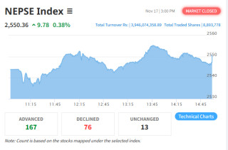 काठमाडौँ ।आइतबारको कारोबारमा नेपाल स्टक एक्सचेन्ज (नेप्से) परिसूचक ९.७८ अंकले वृद्धि भई २५५०.३६ बिन्दुमा पुगेको छ, जुन ०.३८ प्रतिशतको उछाल हो। दिउँसो ३ बजे बजार बन्द हुँदा नेप्से सूचक दिनभर उतारचढावभित्र रहेर अन्त्यतिर हरियो रंगमै बन्द भएको देखिन्छ। नेप्सेले सार्वजनिक गरेको सूचकअनुसार आज कुल ३,९४६,०७४,३५८.८९ रुपैयाँ बराबरको कारोबार भयो। कुल ८८