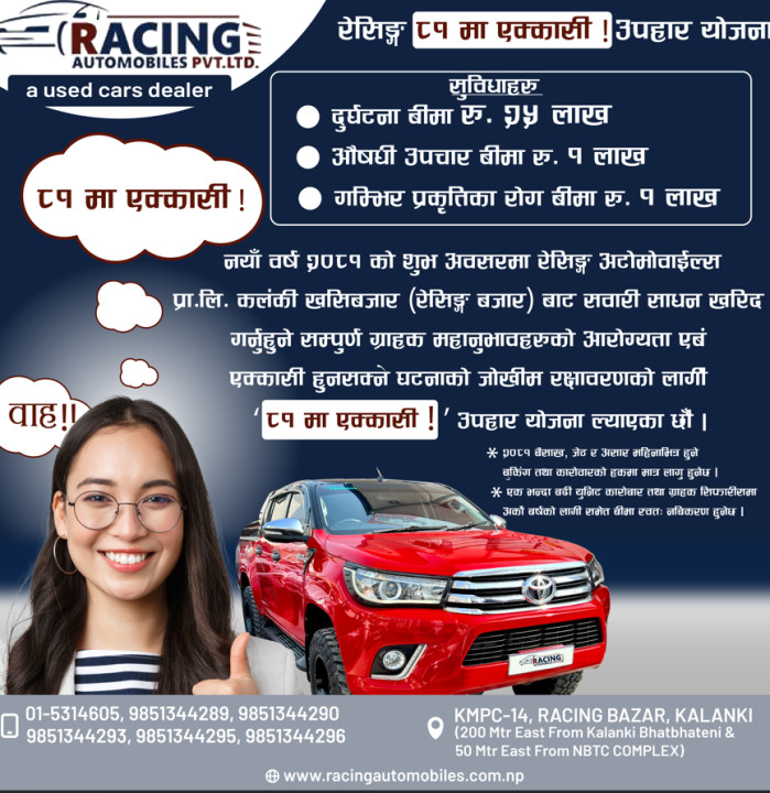 काठमाडौं । रेसिङ अटोमोबाइल्सले नयाँ वर्ष विक्रम संम्बत २०८१ को अवसरमा आफ्ना ग्राहकहरूका लागि आकर्षक उपहार योजना सार्वजनिक गरेको छ । ८१ मा एक्कासी उपहार योजना अन्तर्गत रेसिङ अटोमोबाइल्सले नयाँ वर्षको अवसरमा गाडी खरिद गर्ने...