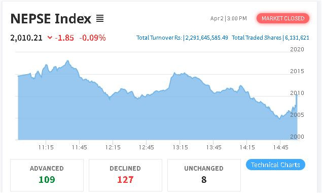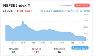 काठमाडौँ । आज नेप्से परिसूचक १ दशमलव ८५ अङ्कले घटेको छ । आज २ अर्ब २९ करोड रुपैयाँभन्दा बढीको सेयर कारोबार भएको छ । २ कम्पनी सकारात्मक सर्किट लेबलमा कारोबार भएका छन् । १३ मध्ये...