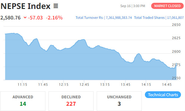 काठमाडौँ । आज नेप्से परिसूचकमा ५७.०३ अंकले घटेर २५८०.७६ बिन्दुमा आएको छ ।आज ७ अर्ब ३६ करोड रुपैयाँभन्दा बढीको सेयर कारोबार भएको छ । ३ कम्पनी सकारात्मक सर्किट लेबलमा कारोबार भएका छन् ।आज सबै समूहका...